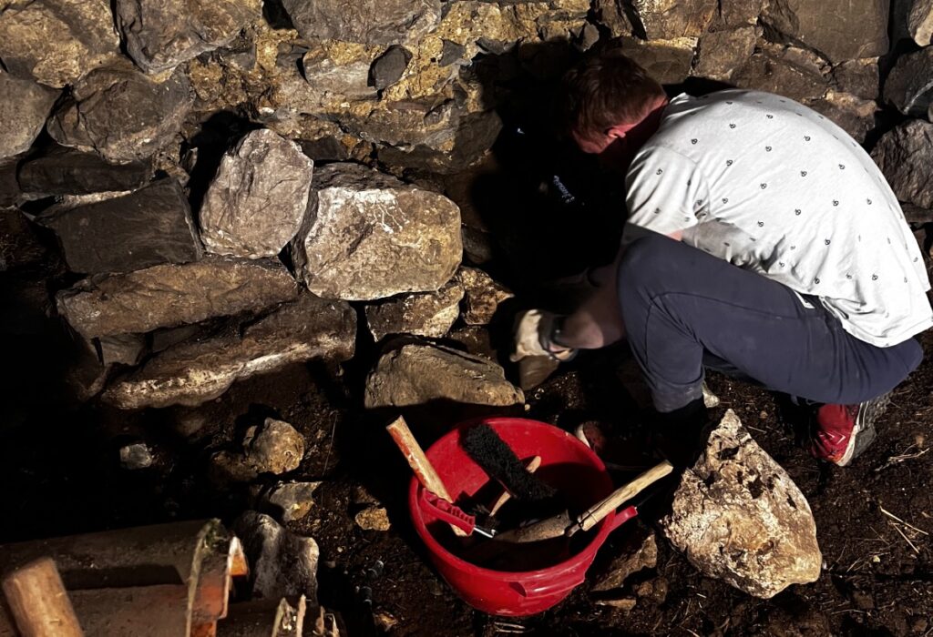 Na al dat ruimen was het dan eindelijk mogelijk om alle draagmuren te beoordelen. En uiteraard kwamen ook hier onverwachte zaken boven water. De vorige eigenaar — of die daarvoor, wie het weet mag het zeggen — heeft, vermoedelijk in benevelde toestand, een gat geslagen in een draagmuur en met de stenen die daarbij loskwamen een knullig vloertje gelegd. Met wat pas- en meetwerk zit alles er nu weer in.