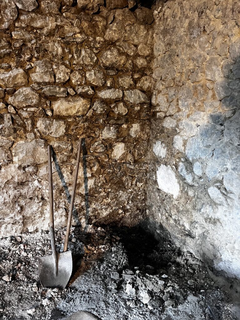 In een groot gedeelte van ons huis is geen sprake meer van een vloer. We bewegen ons binnen van bergje naar kuil. Alles is eruit gejast. Na een aantal betonnen lagen werd er een oude, vergane stro-laag aangetroffen. En weer wat verder naar benee de leistenen ondergrond waar de muren van het huis op rusten. Met de hand probeer ik zo’n 20 centimeter toekomstige stahoogte te winnen, maar het kan zijn dat hiervoor uiteindelijk toch een machine wordt geregeld, want eigenlijk is dit gekkenwerk.